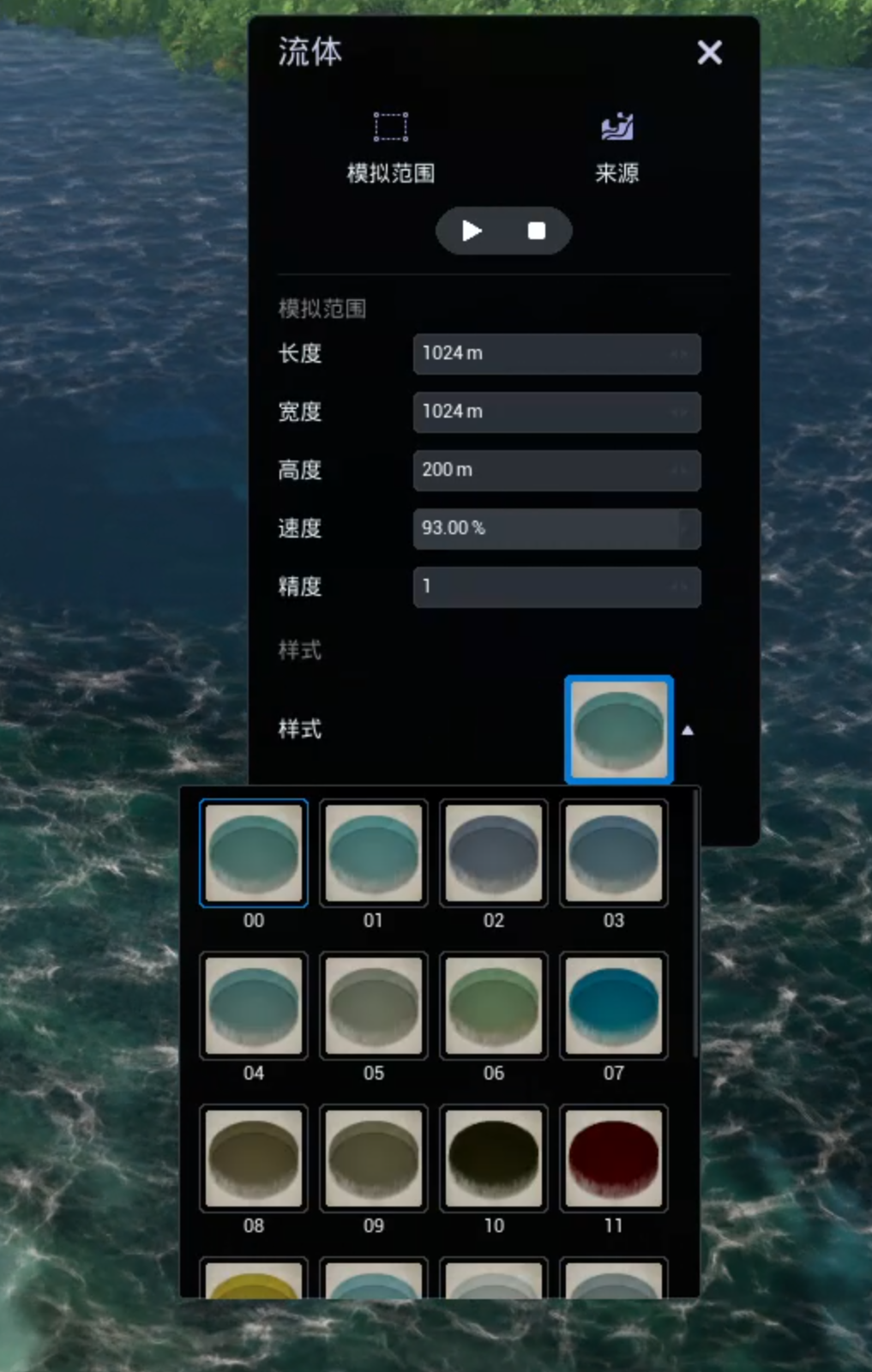 style (number) 流体样式,共28种水样式,取值范围:[0~27],样式参考流体的样式预览图