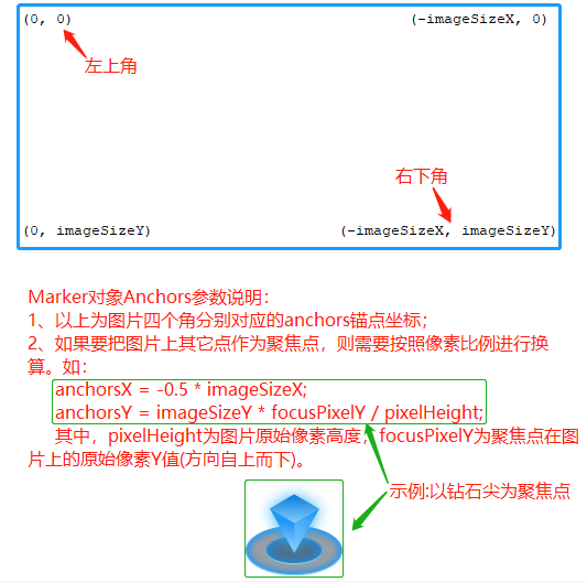 anchors (array) 锚点: [x, y],设置Marker的聚焦图片位置的偏移,默认值:[0,0],取值规则如下图: